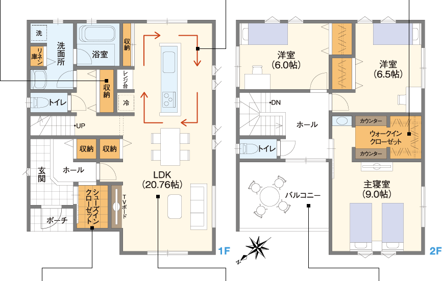 主寝室には、大容量ウォークインクローゼットを設置。丈の長いコートやスーツケースなどの大型荷物まで、バッチリ収納可。